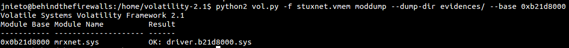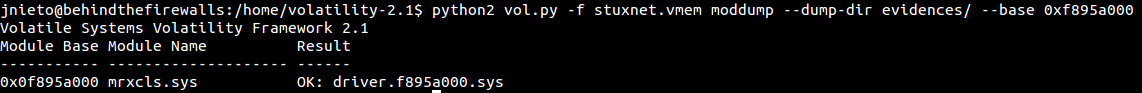 Extraction du driver suspect mrxcls.sys à partir de la mémoire via le plugin moddump, en ciblant son adresse de base (0xf895a000). Le module est dumpé avec succès sous la forme driver.f895a000.sys dans le répertoire evidences/. Cette opération confirme la présence active du composant en mémoire et permet de l’isoler pour des analyses approfondies (reverse engineering, détection, IOC). Ce type de driver est typiquement utilisé par des malwares avancés comme Stuxnet pour opérer au niveau kernel et échapper aux mécanismes de détection classiques.