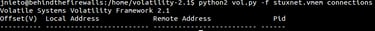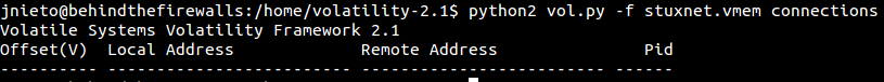 Sortie du plugin connections de Volatility (v2.1) exécuté sur l’image mémoire stuxnet.vmem. Aucune connexion TCP active n’est identifiée dans les structures réseau au moment de la capture, ce qui suggère soit une absence d’activité réseau du malware à cet instant précis, soit l’utilisation de techniques de communication furtives ou différées non visibles via ce plugin.