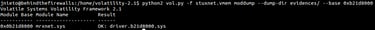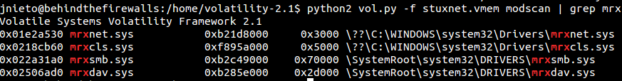 Filtrage des modules noyau via modscan avec grep pour isoler les drivers suspects liés à la famille MRX (mrxnet.sys, mrxcls.sys, etc.). La présence de ces modules, notamment mrxnet.sys, est fortement associée à Stuxnet, qui utilise des drivers malveillants pour s’ancrer au niveau kernel. Cette étape permet d’identifier rapidement les artefacts critiques dans la mémoire et de cibler les composants à extraire pour une analyse approfondie.