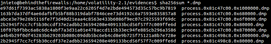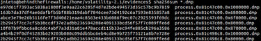 Calcul des empreintes cryptographiques SHA256 des artefacts mémoire extraits (*.dmp) à l’aide de la commande sha256sum. Chaque fichier correspond à une région mémoire précédemment identifiée comme suspecte via malfind. Cette étape permet de garantir l’intégrité des données, d’assurer leur traçabilité dans le cadre de l’analyse forensic et de faciliter leur corrélation avec des bases de signatures connues (threat intelligence, antivirus, sandbox). La présence de hachages identiques pour certains fichiers suggère que plusieurs régions mémoire contiennent un même payload ou des portions identiques de code injecté, ce qui renforce l’hypothèse d’une injection répétée ou d’une propagation interne du code malveillant au sein de différents processus.