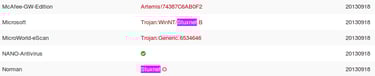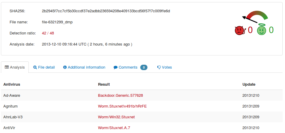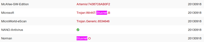 Résultat d’analyse multi-antivirus du fichier extrait, mettant en évidence une détection majoritaire comme Stuxnet (Trojan/variant). Plusieurs moteurs (Microsoft, Norman, etc.) identifient explicitement la signature du malware, confirmant la nature malveillante du driver analysé. Cette corrélation entre empreinte SHA256 et bases antivirus renforce la preuve technique et valide l’attribution de l’échantillon à une souche connue de cyber-arme avancée.