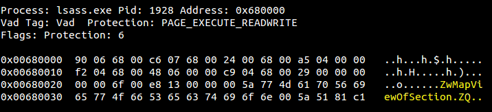 Sortie du plugin malfind appliqué au processus lsass.exe (PID 1928), mettant en évidence une région mémoire suspecte située à l’adresse 0x680000, avec des permissions PAGE_EXECUTE_READWRITE. Contrairement aux segments contenant un en-tête PE complet, cette zone présente du code brut (shellcode) accompagné de chaînes partielles, notamment des fragments liés à des fonctions système telles que ZwMapViewOfSection. Ce type de contenu est caractéristique d’un payload injecté de manière furtive, conçu pour interagir directement avec les mécanismes bas niveau du système sans passer par un exécutable complet. L’association de code exécutable, de permissions RWX et de références à des API critiques du noyau constitue un indicateur fort d’injection malveillante avancée, typiquement observée dans des malwares sophistiqués comme Stuxnet.