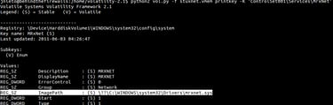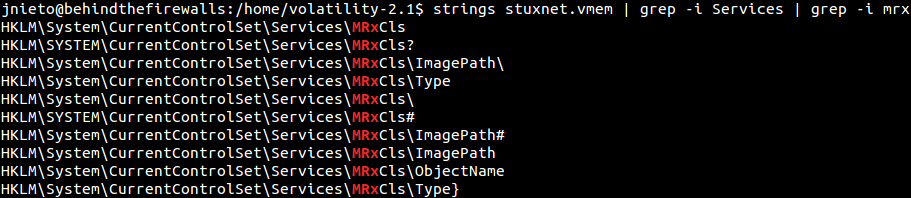 Recherche de chaînes mémoire révélant des clés de registre associées au service malveillant MRxCls. Les entrées trouvées dans HKLM\System\CurrentControlSet\Services\MRxCls (ImagePath, Type, ObjectName) confirment la persistance du driver dans le système Windows. Cette technique met en évidence le mécanisme d’installation du rootkit, qui s’enregistre comme service pour être chargé au démarrage, illustrant une méthode classique de maintien d’accès utilisée par Stuxnet.