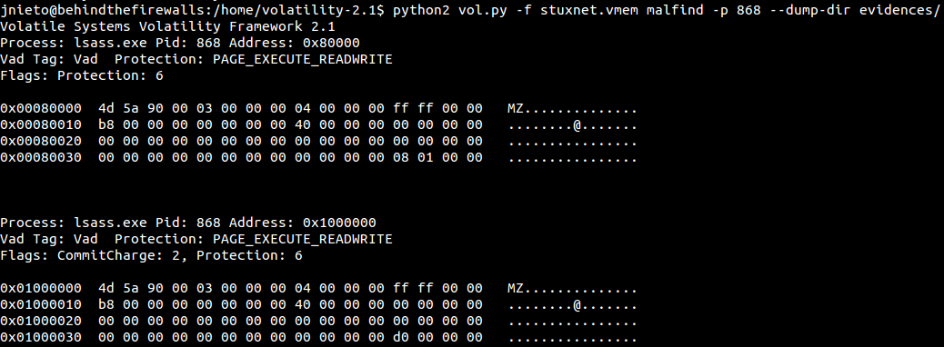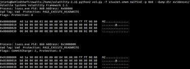 Sortie du plugin malfind appliqué au processus lsass.exe (PID 868), avec extraction des régions mémoire suspectes vers le répertoire evidences/. Deux segments mémoire distincts sont identifiés avec des permissions PAGE_EXECUTE_READWRITE, indiquant des zones simultanément exécutables et modifiables, typiquement utilisées pour l’injection de code. La présence explicite de la signature MZ au début de ces régions confirme qu’il s’agit de structures exécutables au format PE chargées directement en mémoire. Ce type de comportement est caractéristique d’une injection de payload malveillant, contournant les mécanismes classiques de chargement des exécutables et renforçant l’hypothèse d’une compromission active du processus par un malware avancé tel que Stuxnet.