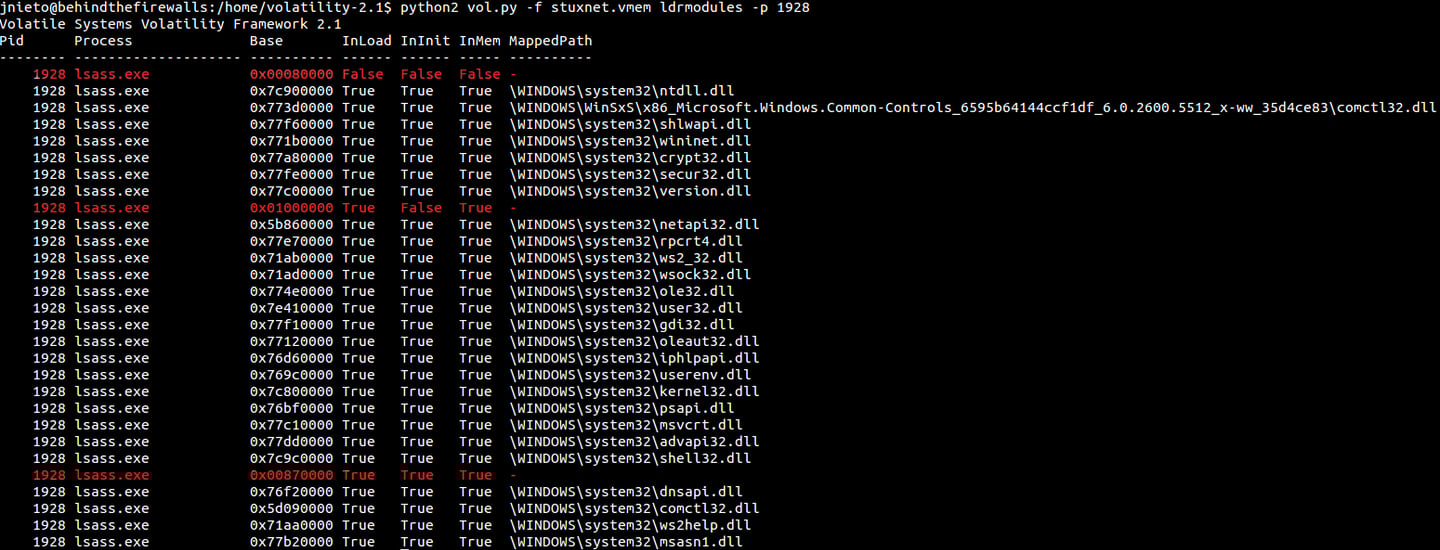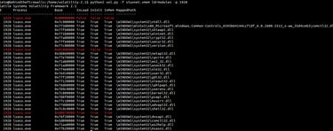 Sortie du plugin ldrmodules appliqué au processus lsass.exe (PID 1928), permettant d’analyser la cohérence des modules chargés en mémoire selon trois vues distinctes : InLoad, InInit et InMem. Plusieurs entrées présentent des incohérences, notamment des modules marqués False dans ces indicateurs tout en étant présents en mémoire, ou inversement. Ces divergences traduisent une désynchronisation entre les listes internes du loader Windows et les structures réellement présentes en mémoire. Ce comportement est caractéristique des techniques de dissimulation utilisées par les malwares avancés, notamment via l’injection de modules non déclarés ou le masquage volontaire dans les structures du système. La présence de ces anomalies dans un processus critique comme lsass.exe constitue un indicateur fort de compromission.