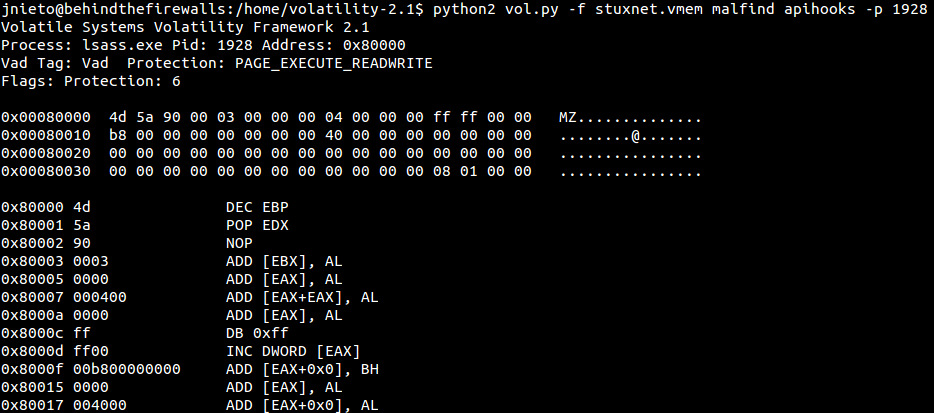 Sortie combinée des plugins malfind et apihooks appliqués au processus lsass.exe (PID 1928), mettant en évidence une région mémoire suspecte marquée PAGE_EXECUTE_READWRITE. La présence d’un en-tête PE valide (MZ) confirme qu’un code exécutable a été injecté directement en mémoire. Le désassemblage affiché révèle des instructions machine associées à ce segment, permettant d’observer le flux d’exécution du code injecté. Ce type d’analyse met en évidence non seulement la présence d’un payload malveillant, mais également son intégration dans le processus cible, potentiellement via des mécanismes de hooking API destinés à intercepter et altérer le comportement normal du système. Ces éléments constituent un indicateur technique fort d’une compromission avancée, typique des techniques utilisées par Stuxnet pour assurer furtivité et contrôle du système.