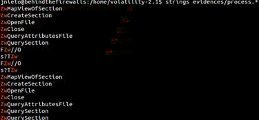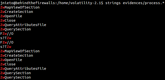 Résultat de l’extraction des chaînes de caractères (strings) à partir des artefacts mémoire précédemment dumpés (process.*). On observe la présence répétée d’appels à des fonctions du noyau Windows de type Zw*, telles que ZwMapViewOfSection, ZwCreateSection, ZwOpenFile ou ZwQuerySection. Ces fonctions sont directement liées à la gestion des sections mémoire, à la manipulation de fichiers et à l’accès bas niveau aux ressources système. Leur présence dans les données extraites constitue un indicateur fort d’activités d’injection de code et de manipulation mémoire avancée. Ce type de primitives est couramment utilisé par les malwares sophistiqués pour charger dynamiquement du code en mémoire, contourner les mécanismes de sécurité et interagir avec le système à un niveau proche du noyau, ce qui est cohérent avec les techniques employées par Stuxnet.
