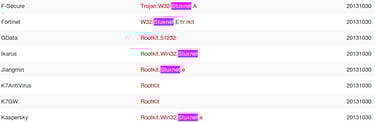 Résultats d’analyse multi-antivirus du driver extrait mrxcls.sys, révélant une détection unanime comme Stuxnet (rootkit) par plusieurs moteurs (F-Secure, Kaspersky, Ikarus, Fortinet…). Les signatures indiquent clairement un comportement de type rootkit kernel, conçu pour dissimuler des activités malveillantes dans le système. Cette convergence de détection confirme sans ambiguïté la compromission avancée de la machine et l’utilisation d’un composant critique de Stuxnet, renforçant la validité des preuves collectées lors de l’analyse mémoire.