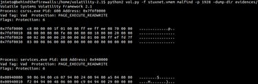 Sortie du plugin malfind appliqué à plusieurs processus système, notamment csrss.exe (PID 600) et services.exe (PID 668), révélant la présence de régions mémoire marquées PAGE_EXECUTE_READWRITE. Contrairement aux cas précédents, ces segments ne présentent pas de signature explicite de type MZ, mais leur nature exécutable et modifiable dans des processus critiques du système constitue un indicateur fortement suspect. Ce type de région mémoire est typiquement utilisé pour héberger du shellcode ou des charges utiles injectées de manière furtive. La présence de telles anomalies dans des processus sensibles suggère une compromission plus large du système, avec propagation de techniques d’injection au-delà d’un seul processus cible, ce qui est cohérent avec le comportement multi-processus observé dans des malwares avancés comme Stuxnet.