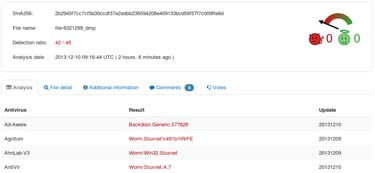 Résultat de l’analyse d’un artefact mémoire extrait (fichier .dmp) soumis à une plateforme de détection multi-moteurs (type VirusTotal). L’empreinte SHA256 correspondante est reconnue par une large majorité de moteurs antivirus (42/48), avec des classifications explicites telles que Worm.Stuxnet, Backdoor.Generic ou variantes associées. Ce niveau de détection élevé confirme sans ambiguïté la nature malveillante de l’échantillon et permet de corréler les observations issues de l’analyse mémoire avec des signatures connues dans les bases de threat intelligence. Cette étape constitue une validation externe essentielle, transformant les indices techniques observés en preuve formelle de compromission liée à Stuxnet.