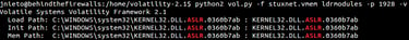 Sortie détaillée (-v) du plugin ldrmodules appliqué au processus lsass.exe (PID 1928), mettant en évidence les chemins de chargement (Load Path, Init Path, Mem Path) d’un module associé à KERNEL32.DLL. Le nom du module présente une structure anormale (KERNEL32.DLL.ASLR.0360b7ab), suggérant une altération ou un renommage non standard lié à des mécanismes d’obfuscation ou d’injection. Bien que les chemins semblent cohérents entre les différentes vues, cette dénomination atypique constitue un indicateur suspect, potentiellement lié à une manipulation de l’espace mémoire visant à masquer un module injecté ou à détourner le chargement légitime des bibliothèques système.