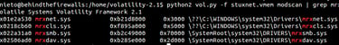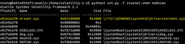 Sortie du plugin modscan de Volatility permettant d’identifier les modules noyau (drivers) présents en mémoire, y compris ceux qui ne sont plus référencés dans les structures standards du système. Le driver mrxnet.sys est ici clairement mis en évidence, avec une adresse de base (0xb21d8000), une taille mémoire associée et un chemin pointant vers C:\WINDOWS\system32\Drivers\mrxnet.sys. La présence de ce module est particulièrement suspecte, car mrxnet.sys est connu pour être un composant malveillant utilisé par Stuxnet. Le recours à modscan est crucial dans ce contexte, car il permet de détecter des modules potentiellement dissimulés par des techniques de rootkit, contournant les mécanismes classiques d’énumération des drivers.